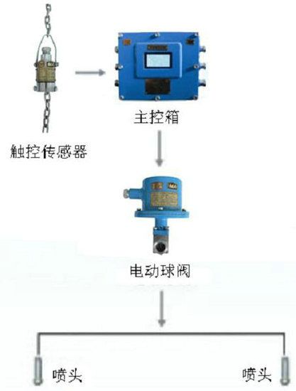 當皮帶運輸機輸煤時,煤流觸動傳感器探桿,觸控傳感器接收到信號觸發(fā)主控箱控制電路,打開電動球閥,裝置自動灑水降塵,無物料時延時一段時間后停止噴霧(延時可調(diào))。
